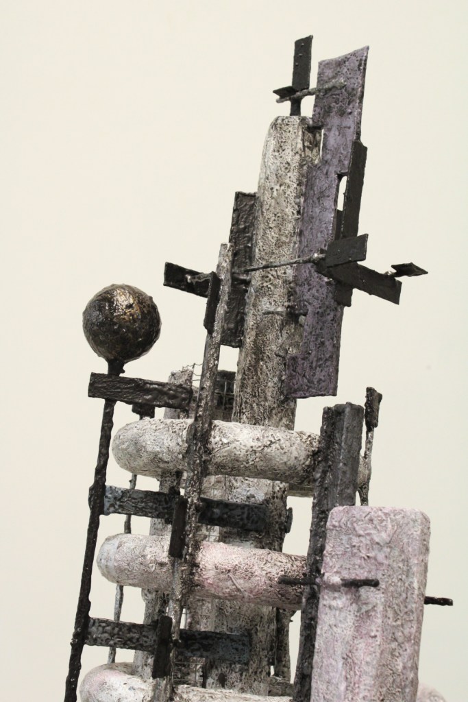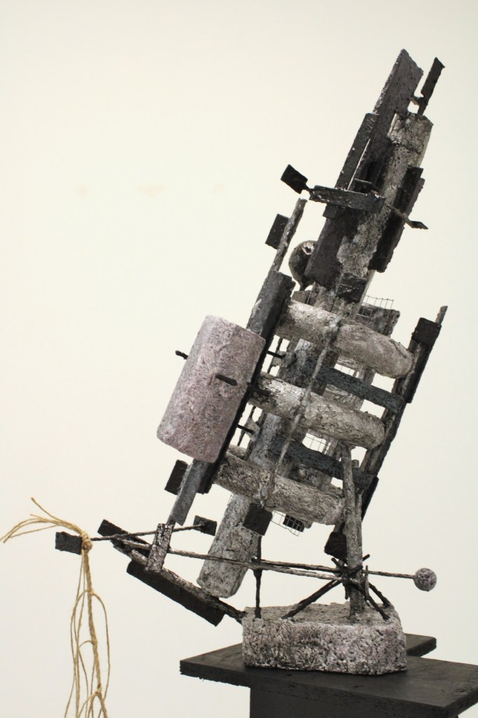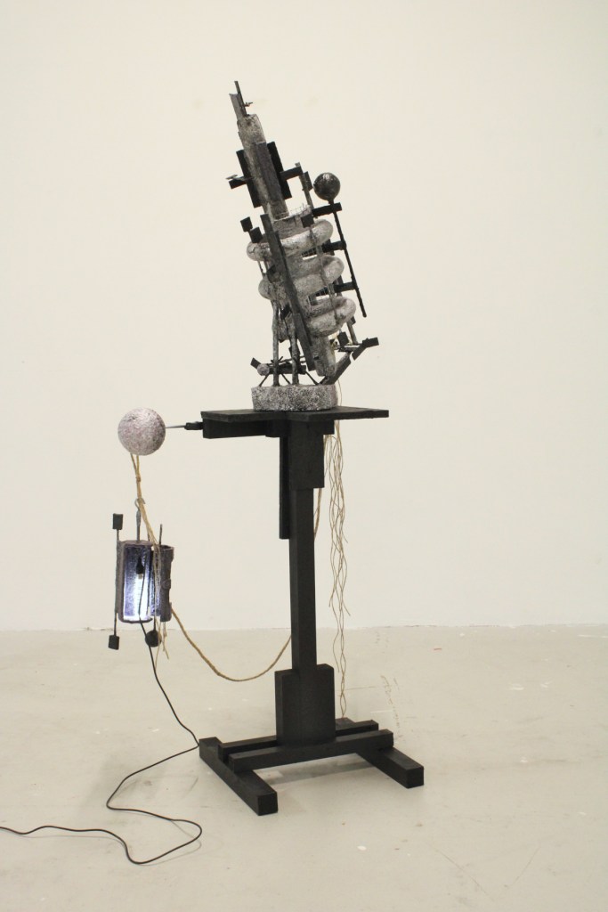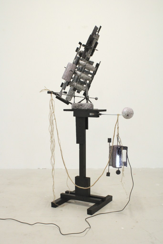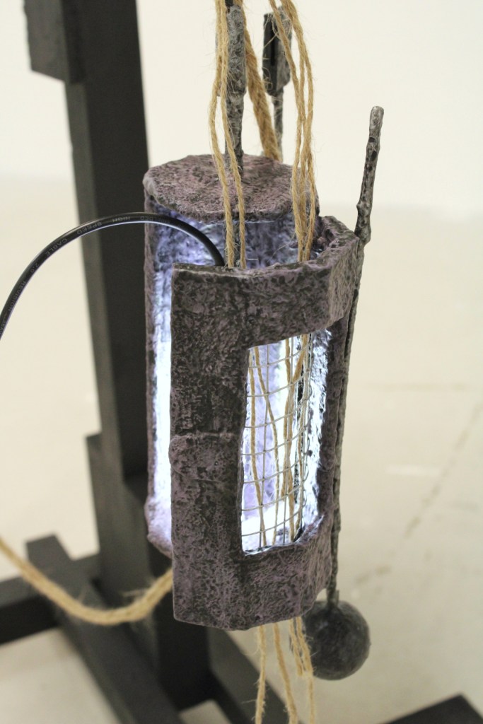 Polystyrene, wood, steel, mesh, threaded rod, jesmonite, l.e.d light, cable, twine, acrylic, sealant. 156 x 54 x 31 cms. 2024.