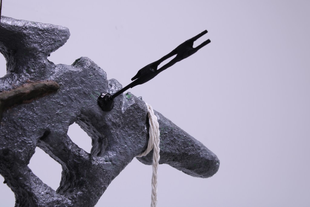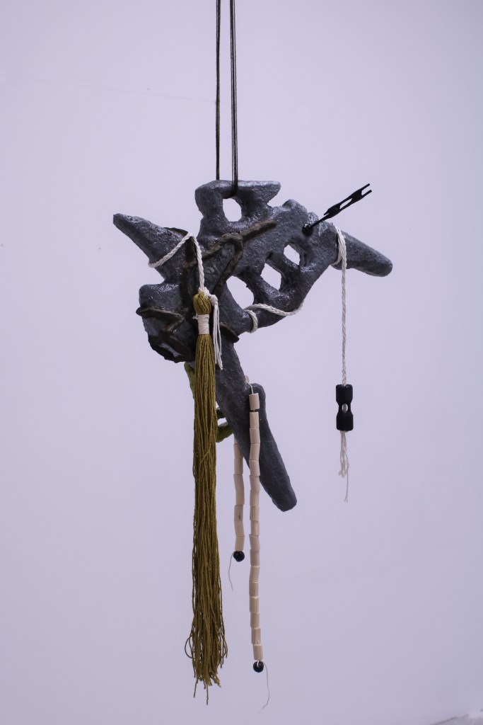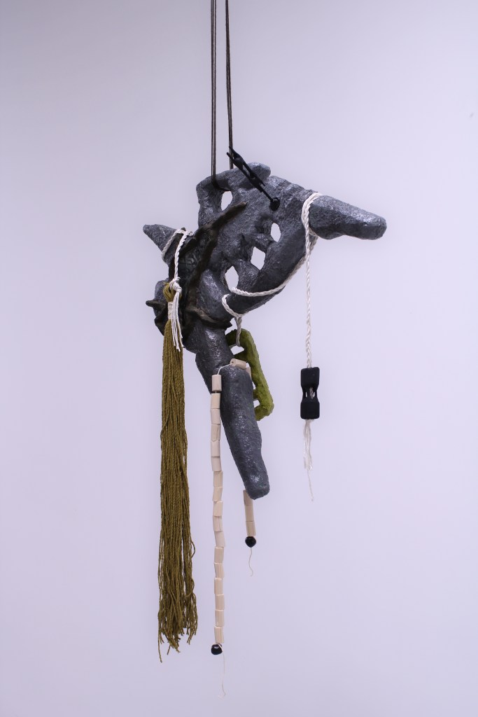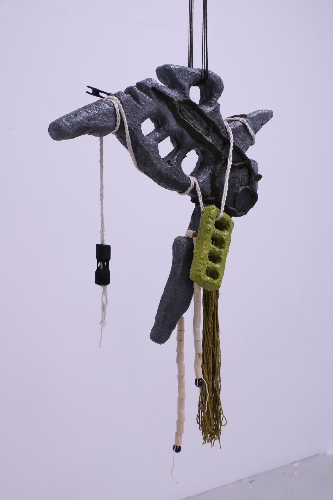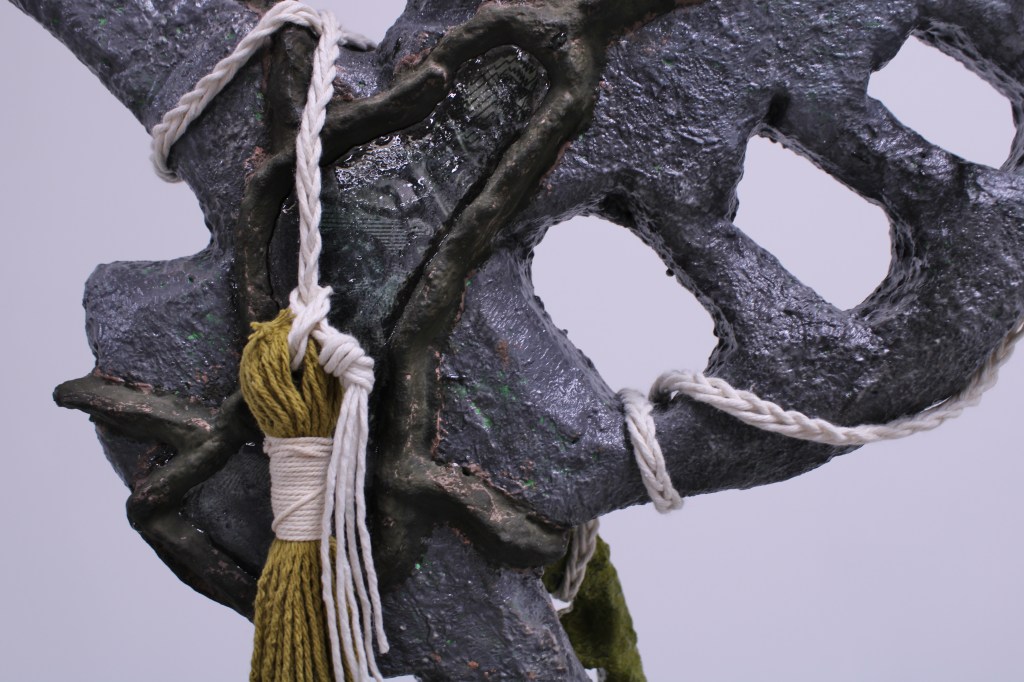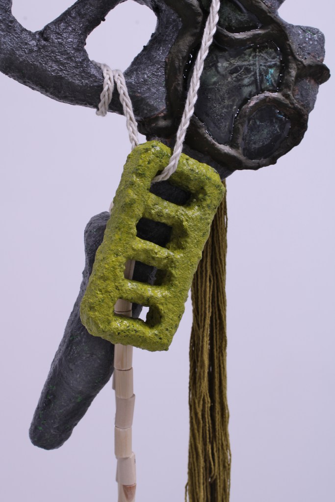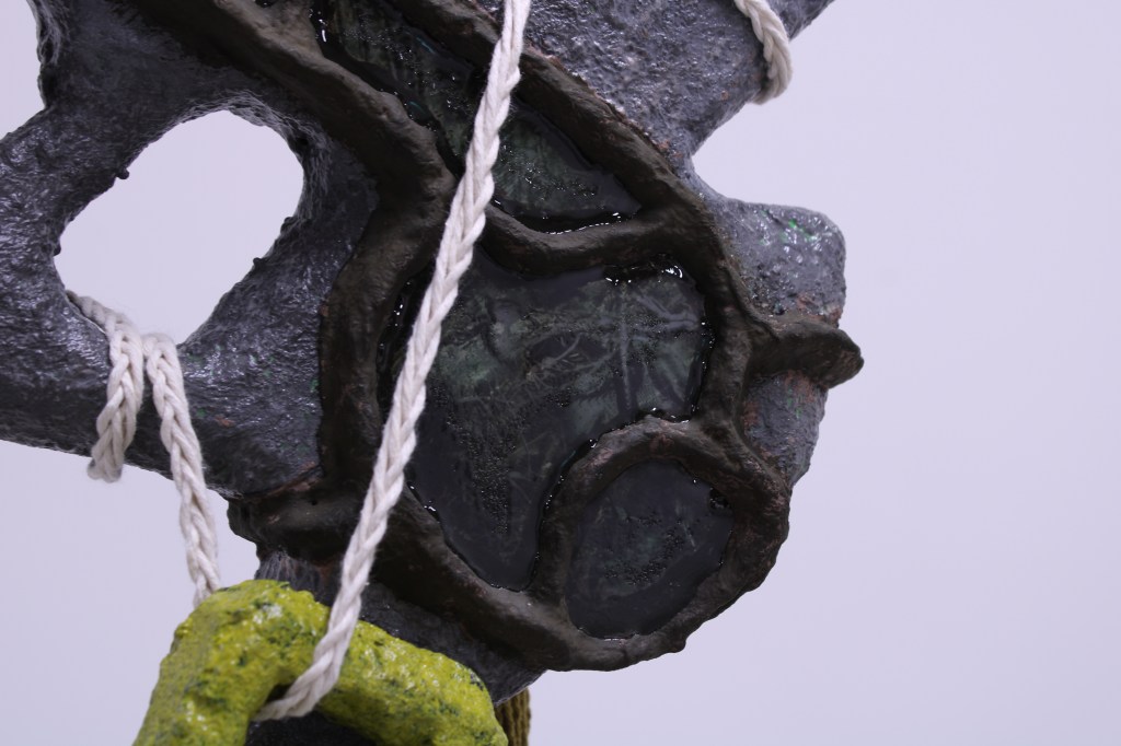 Polystyrene, jesmonite, thermoplastic, polyester resin, epoxy resin, wood, steel, twine, yarn, inkjet prints, clay, sealant, spray paint, pigment, acrylic. 52 x 51 x 24 cms. 2021.