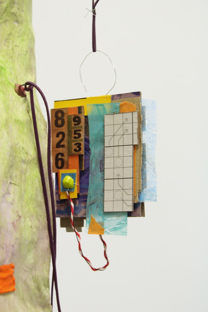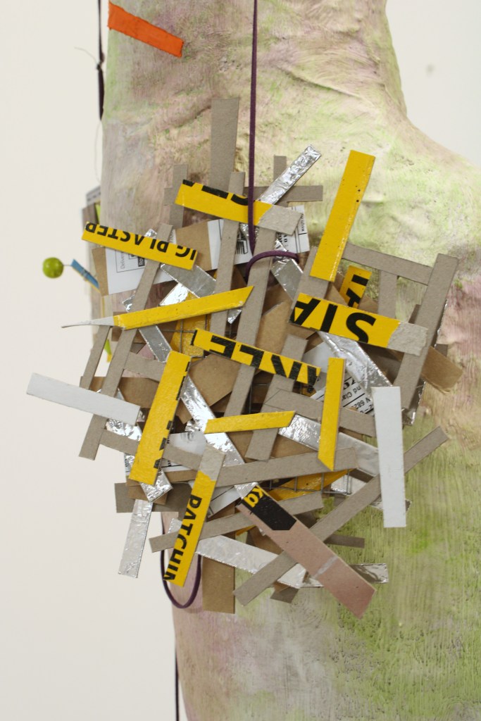 Wire, paper, jesmonite, paper, plastic packaging, tinfoil, digital prints, wood, tape, twine, leatherette, rubber, synthetic moss, glue, acrylic, sealant.