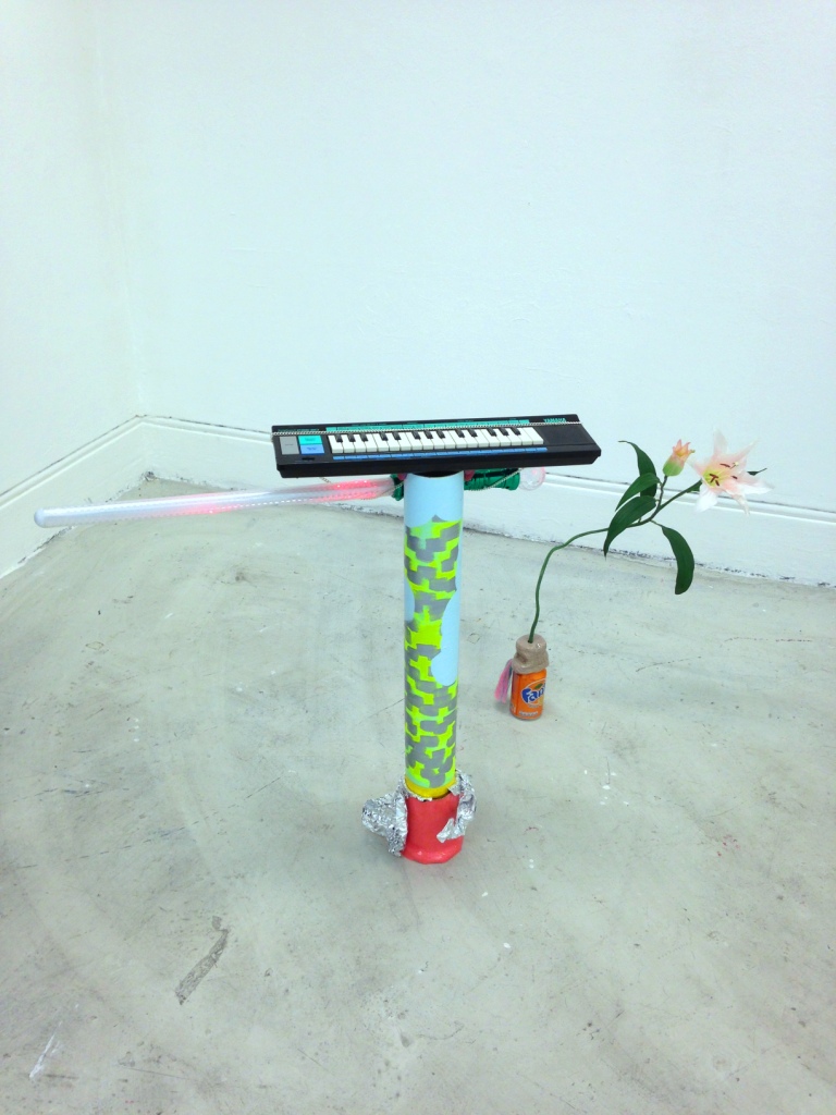 Yamaha keyboard, imitation gold necklace, led toy sword, ceramic, Fanta can, artificial orchid, thread, tinfoil, cardboard, emulsion, varnish. 2015.