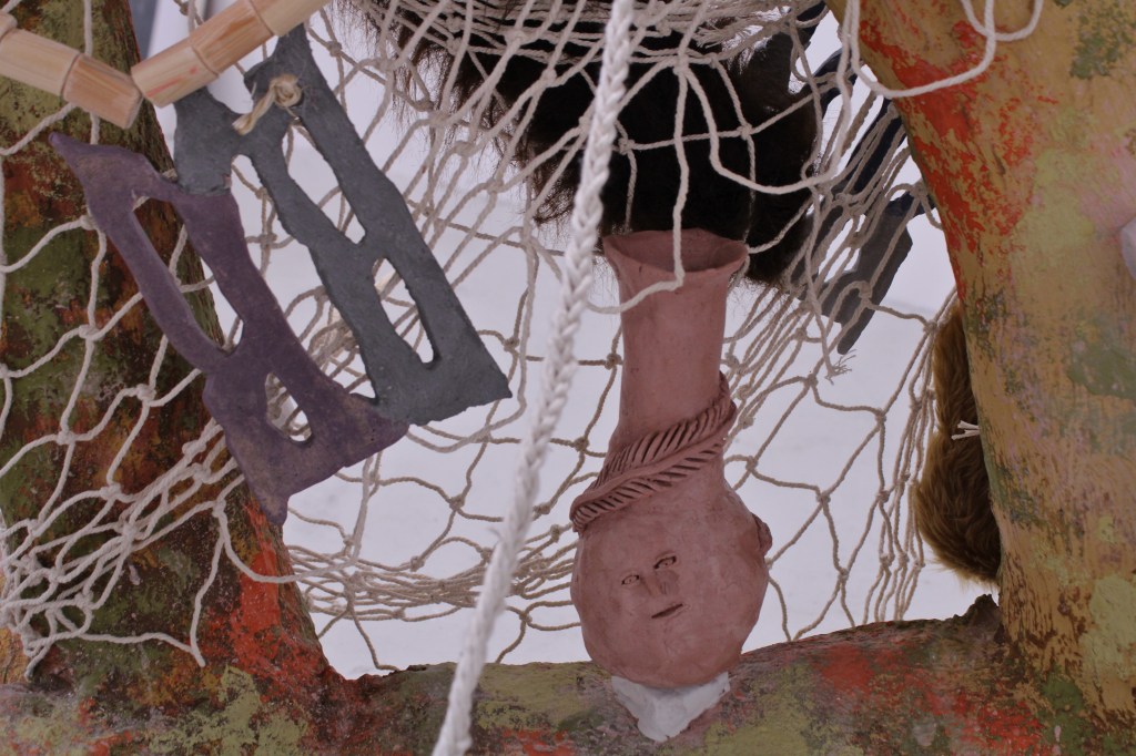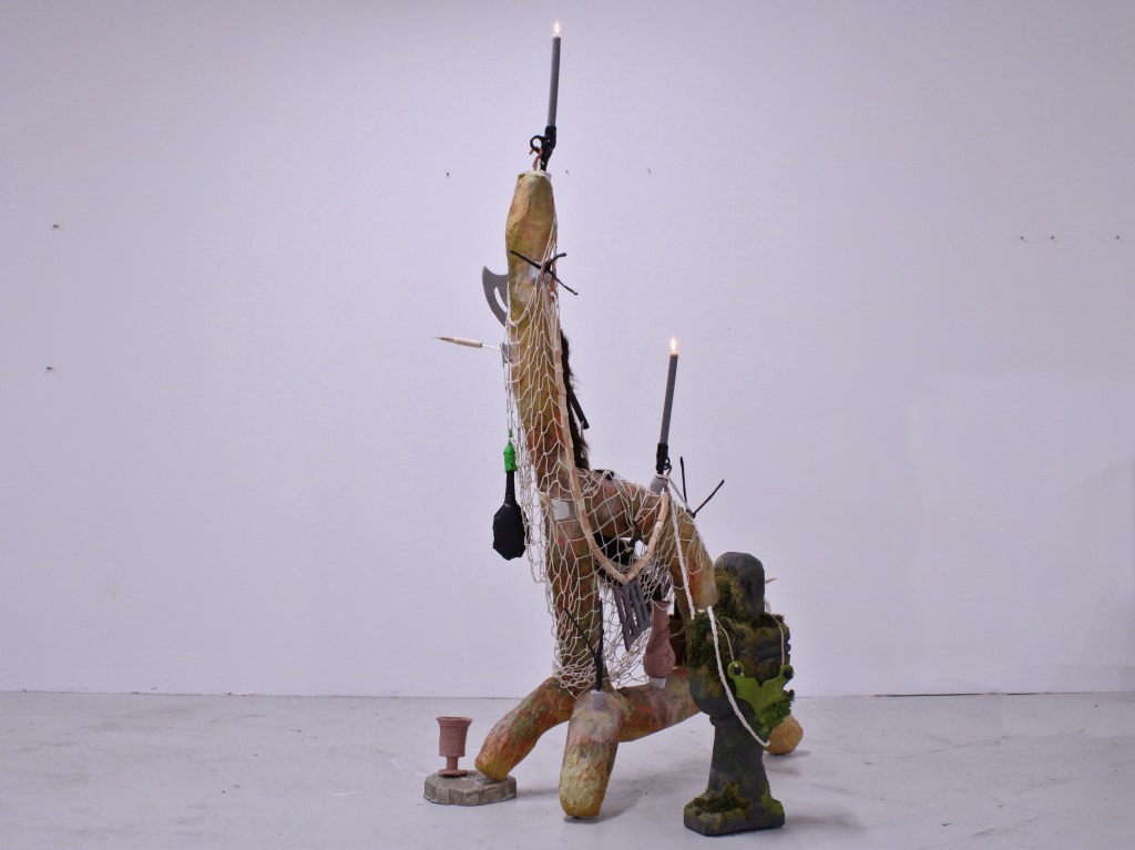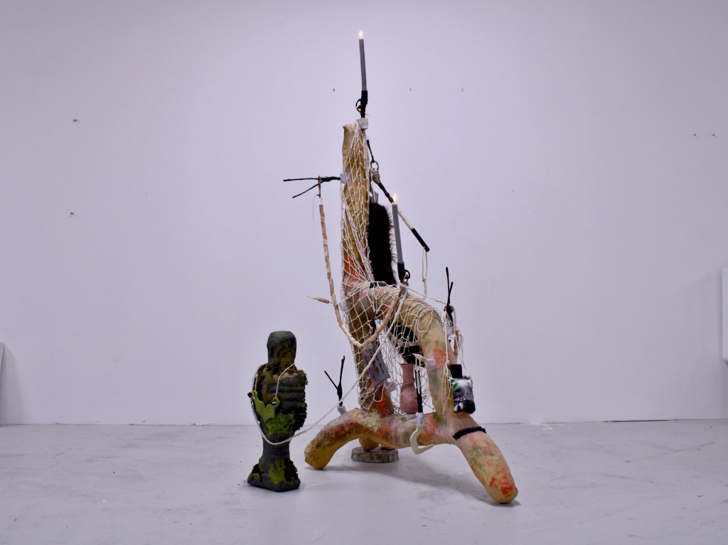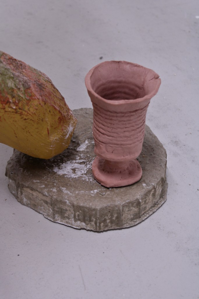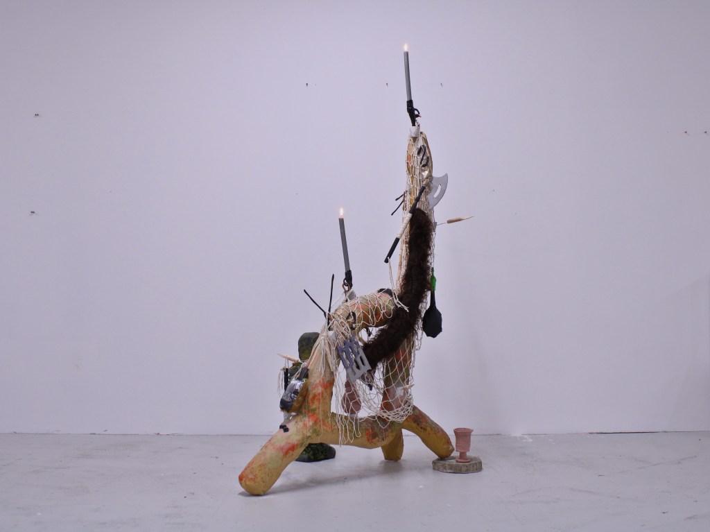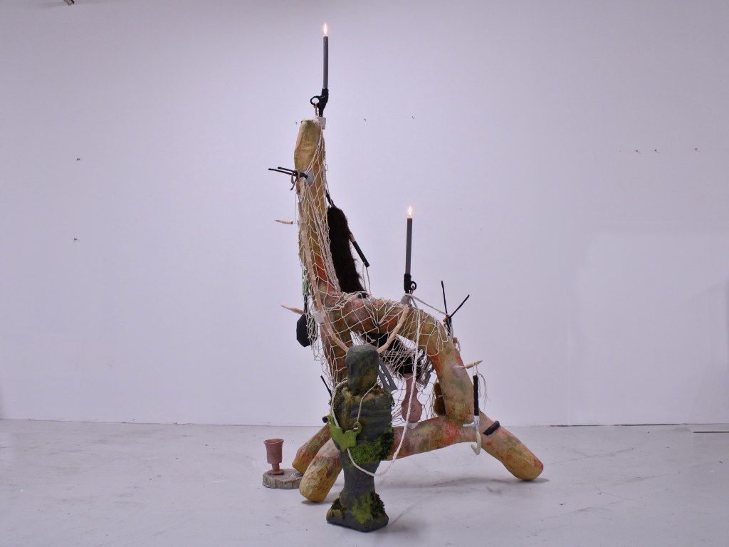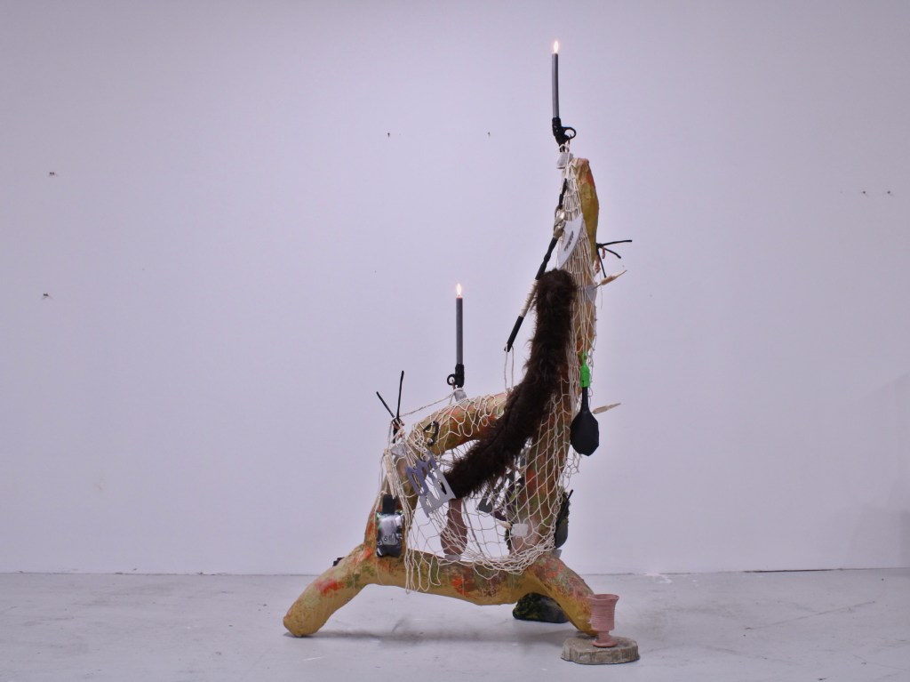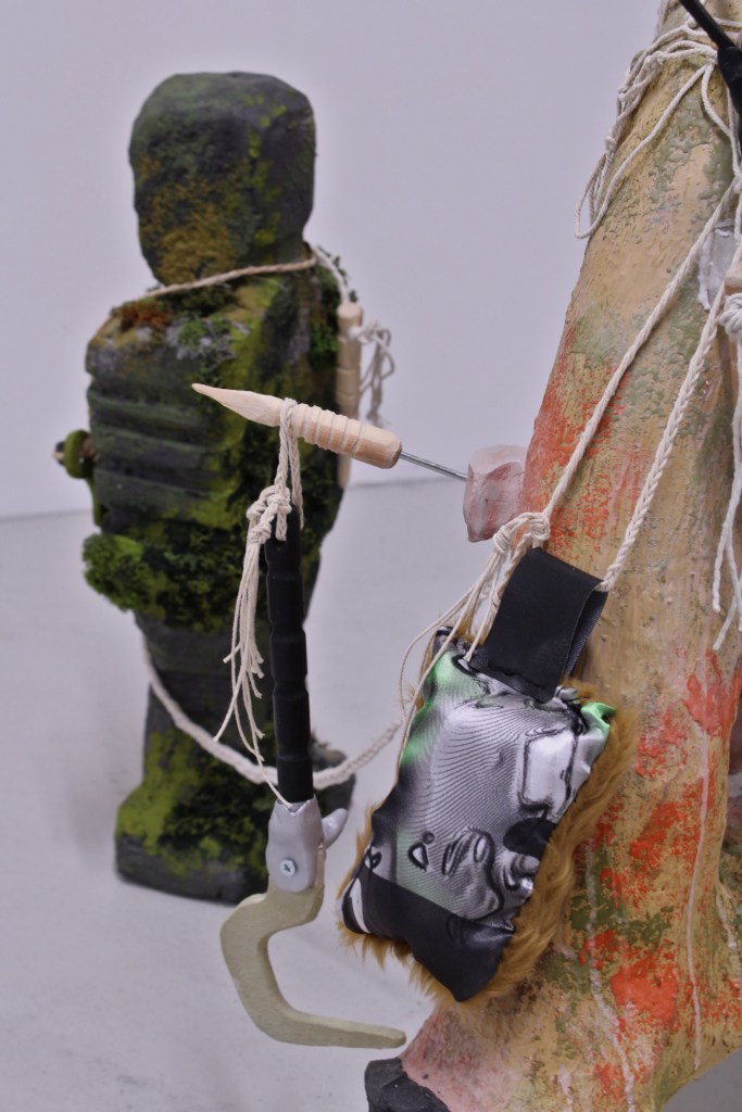 Jesmonite, wire, paper, clay, thermoplastic, concrete, wood, twine, synthetic moss, synthetic fur, printed fabric, leatherette, steel, candles, foam, spray paint, acrylic paint, pigment.
