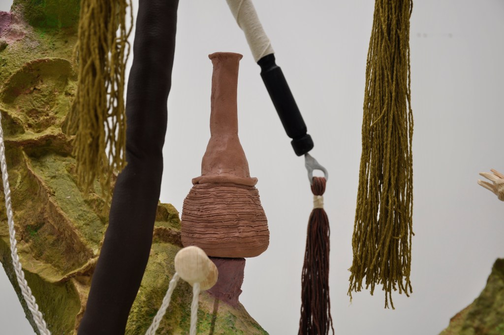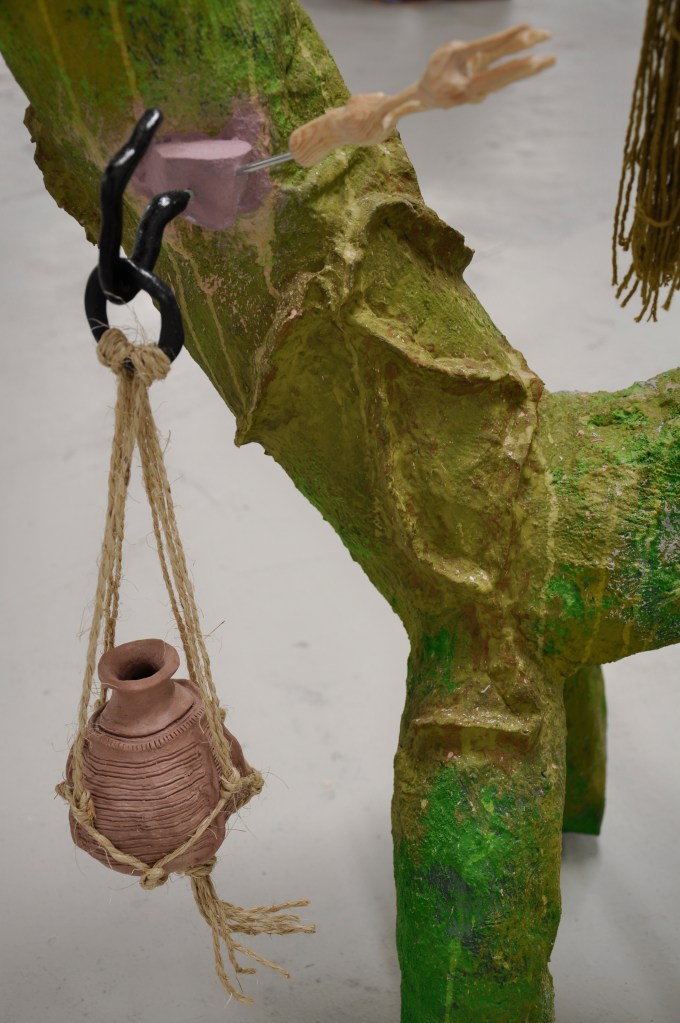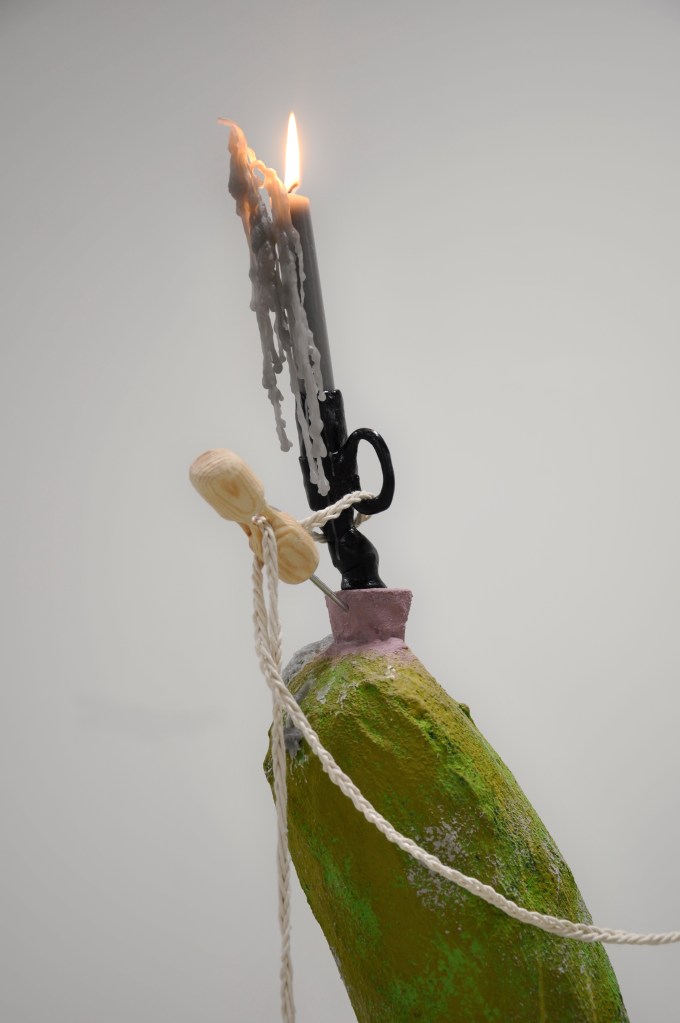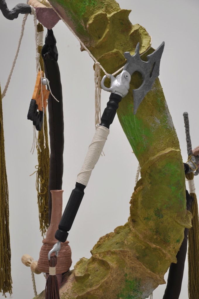 Wire, paper, jesmonite, thermoplastic, wood, steel, candle, synthetic leather, twine, clay, spray paint, pigment, pva. 144 x 96 x 52 cms. 2021.