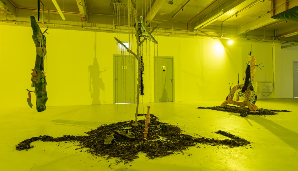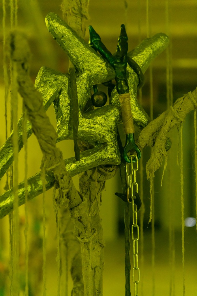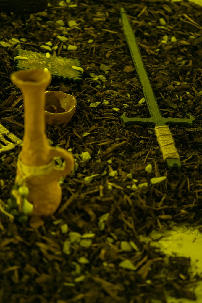 “Crumbling ecologies and evaporating teleologies gift the double vision of a morphed Janus, where the ancient and future exist as a continuum of contorted timelines. Within this murky topology, huddled along its foggy vectors, relics and technologies mutate into weird chimeras, offering glimpses of adjacent zones. A reversed archaeology. Spilling forth from skewed thresholds, a miscellany of spectral artefacts. Caught in its slipstream, proxies of trade, conflict, and ritual coalesce into wreathed formations, blurring distinctions of linear temporalities and predestination. Navigate these vectors with care. Their tendrils span endlessly.”