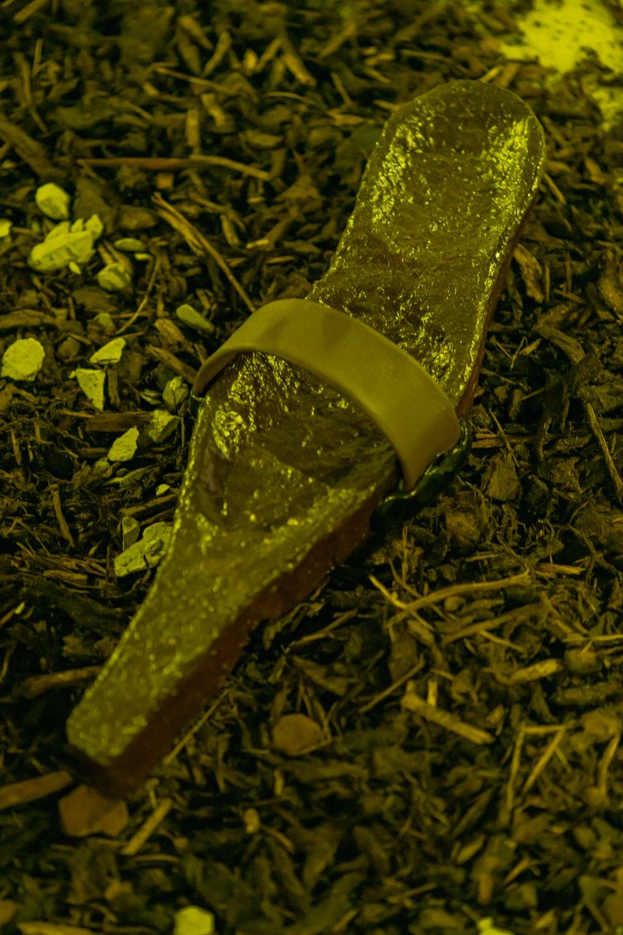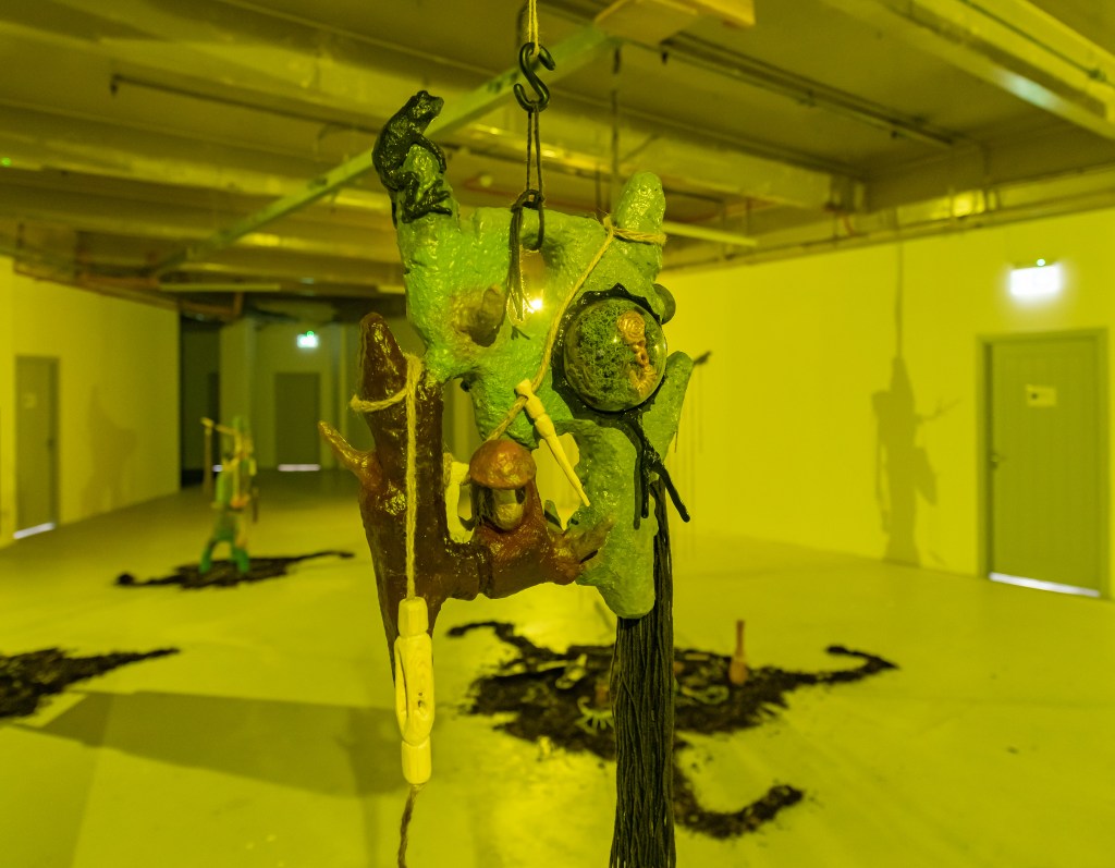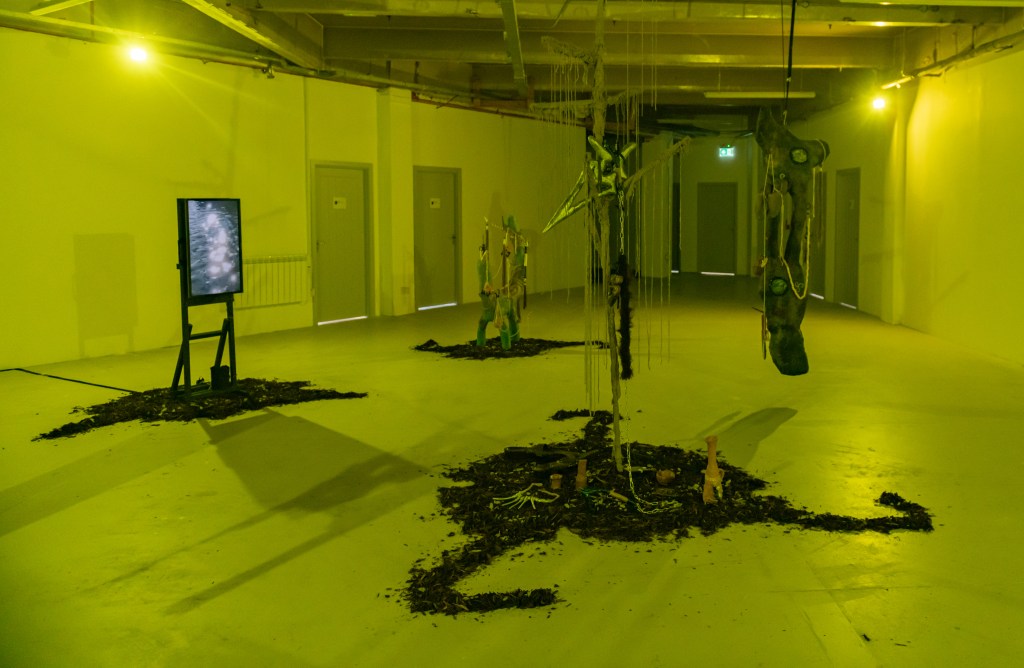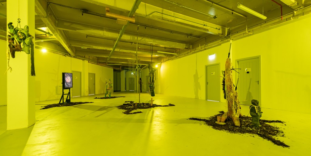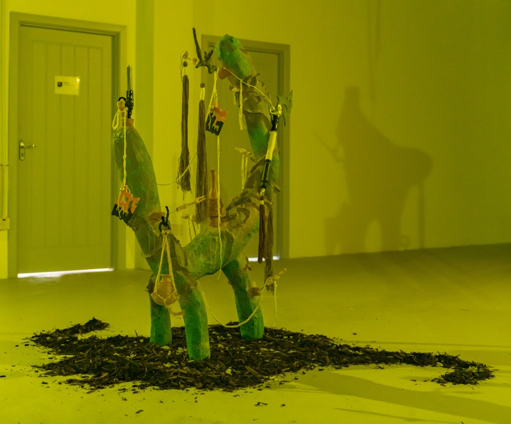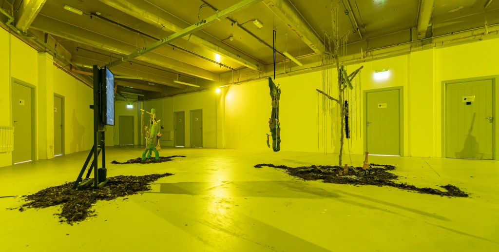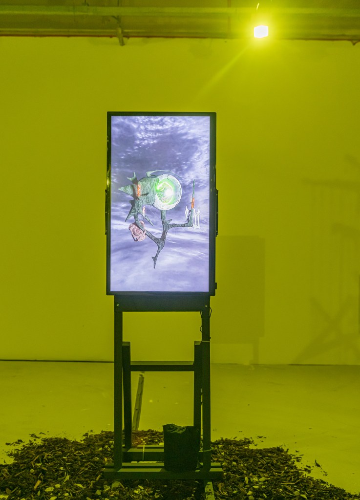 “Huddled On Foggy Vectors” features works in sculpture, video, and digital media by Belfast based artist Gerard Carson. The exhibition draws upon Carson’s research in ecology, speculative realism, and practices of fiction to discern the precarious conditions of the contemporary and the use of world-building practices to produce alternative forms of narrative and meaning. Drawing upon themes of archaeology and science-fiction, such as the novel “Hard to Be a God” [1] [2] and the short story “Mozart in Mirrorshades” [3], the exhibition speculates upon technological histories and knowledges, producing a techno-mythic environment populated with recurring motifs and forms that resemble hybrids of archaic and futural materialities. Exhumed artefacts transmute and gain alchemical energies, portals emerge, and lithic assemblages crop up and to become carriers of these collected troves.
