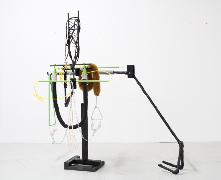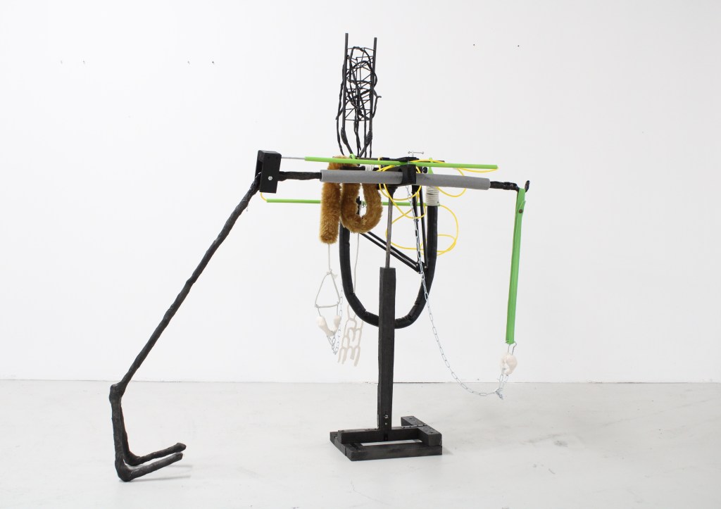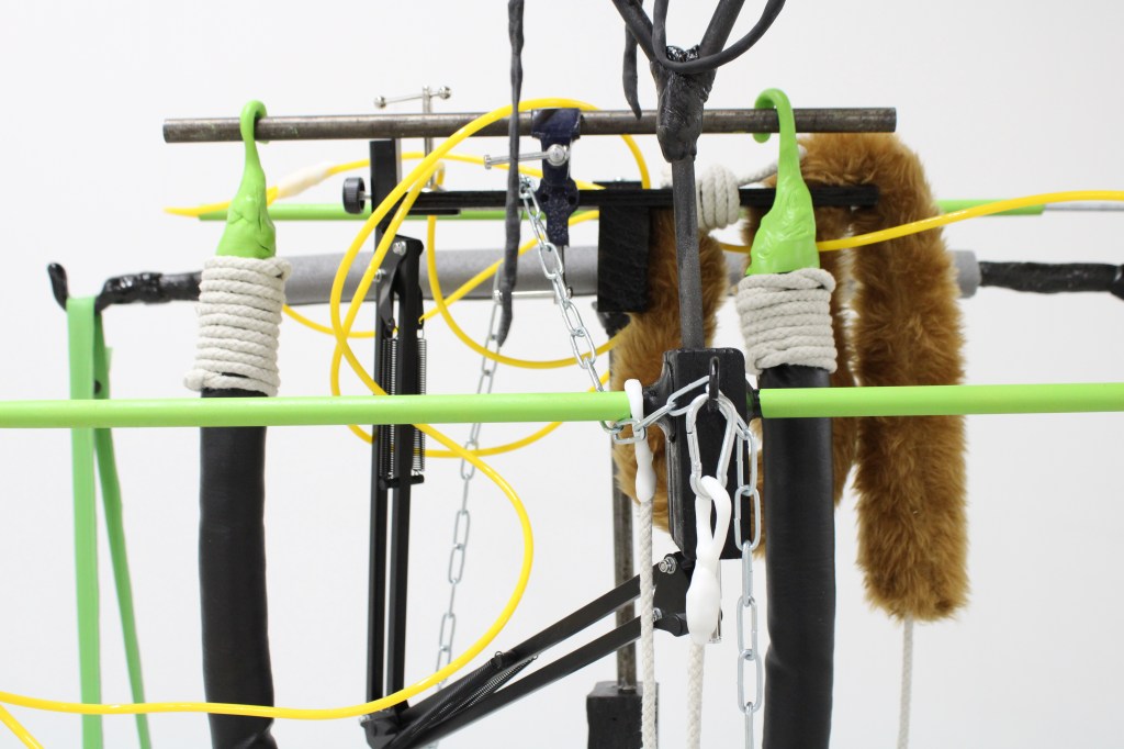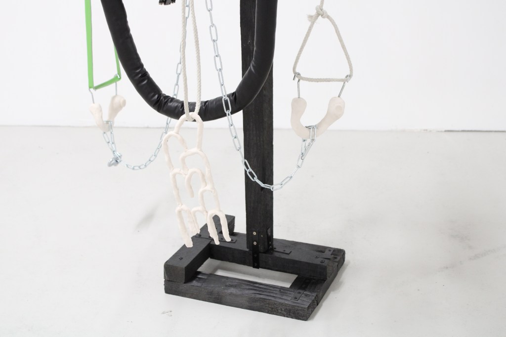 Wood, steel rods, threaded rods, thermoplastic, steel chain, faux fur, synthetic leather, jesmonite, sash cord, carabiner, shackles, silicone, vice, articulated stand, polyurethane tubing, spray paint, epoxy resin. 138 x 65 x 160 cms. 2019.