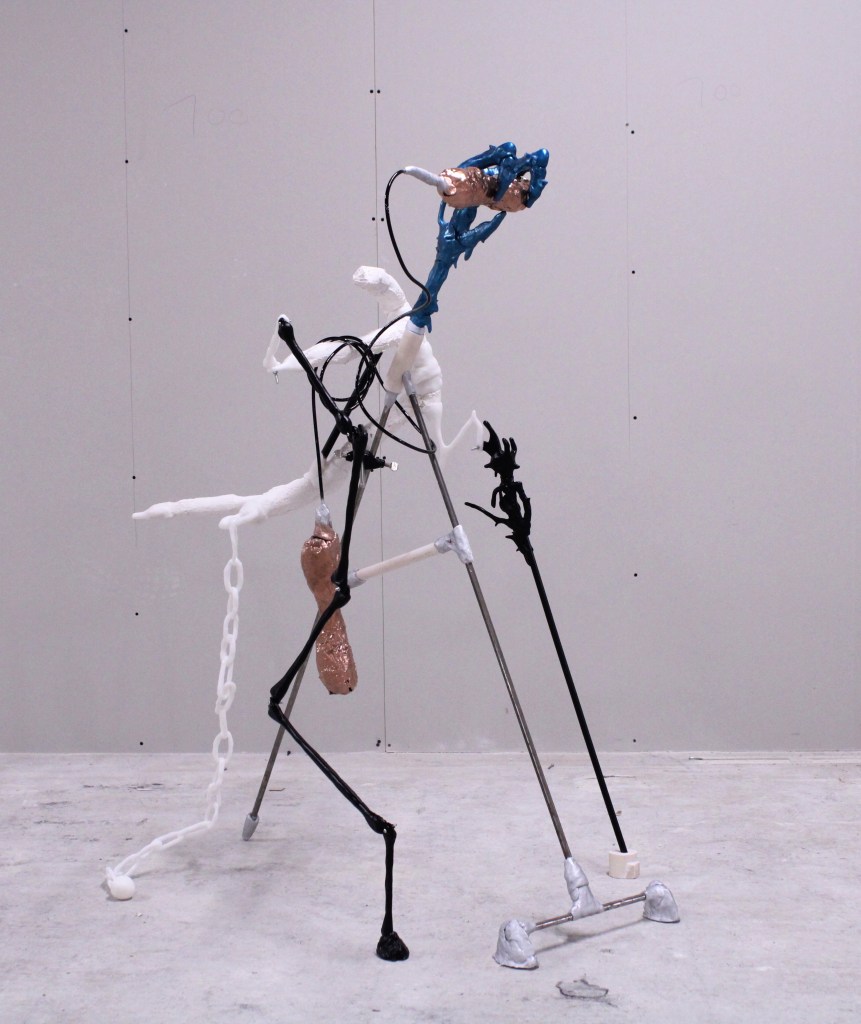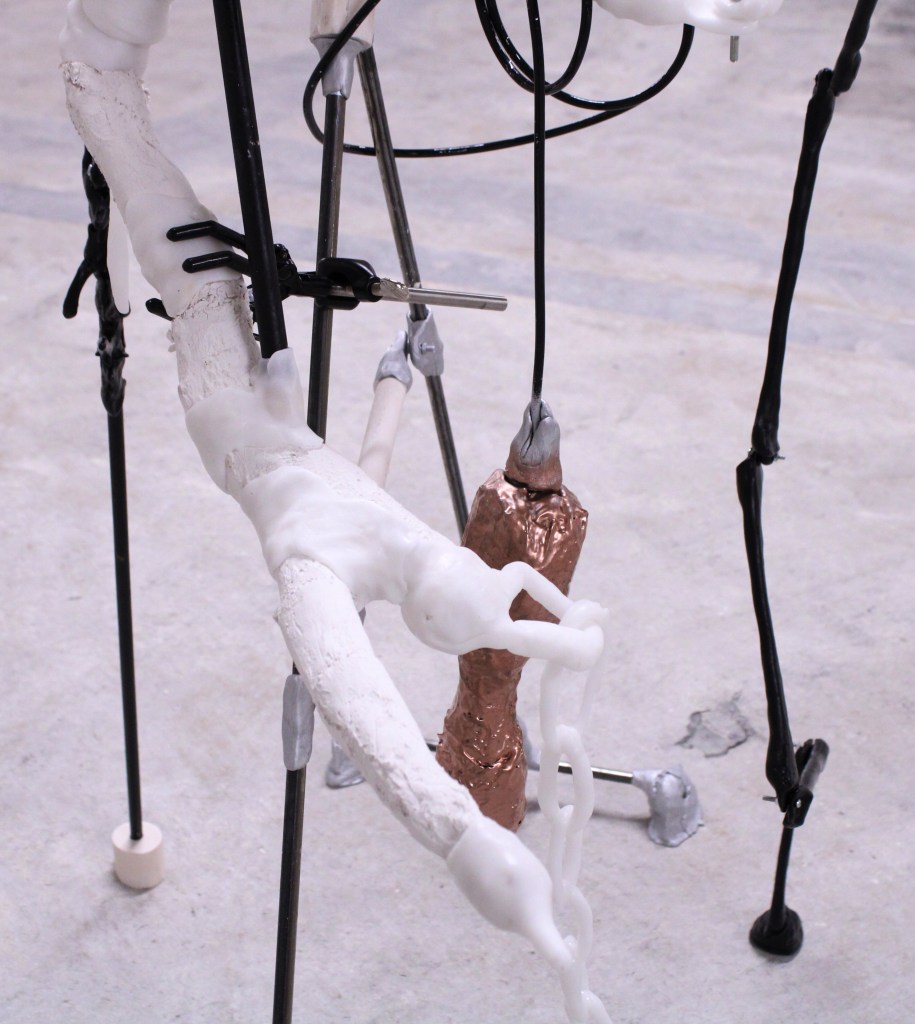 Steel, thermoplastic, jesmonite, resin, polyurethane tubing, retort clamp, wood, hessian, plaster, paper, tape, spray paint. 133 x 112 x 55 cms. 2019.