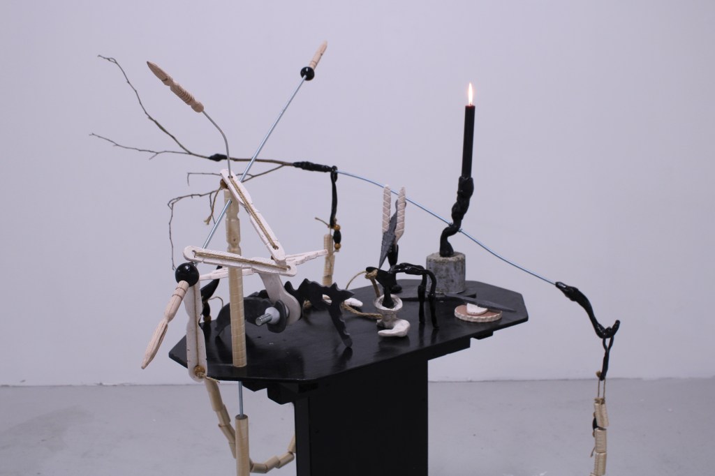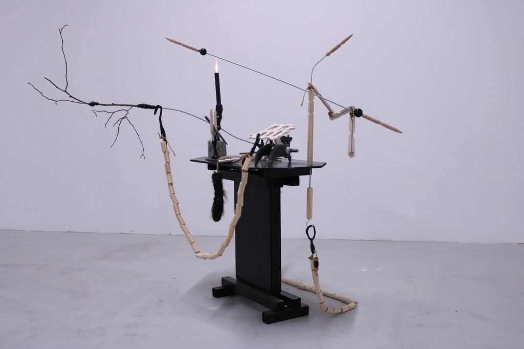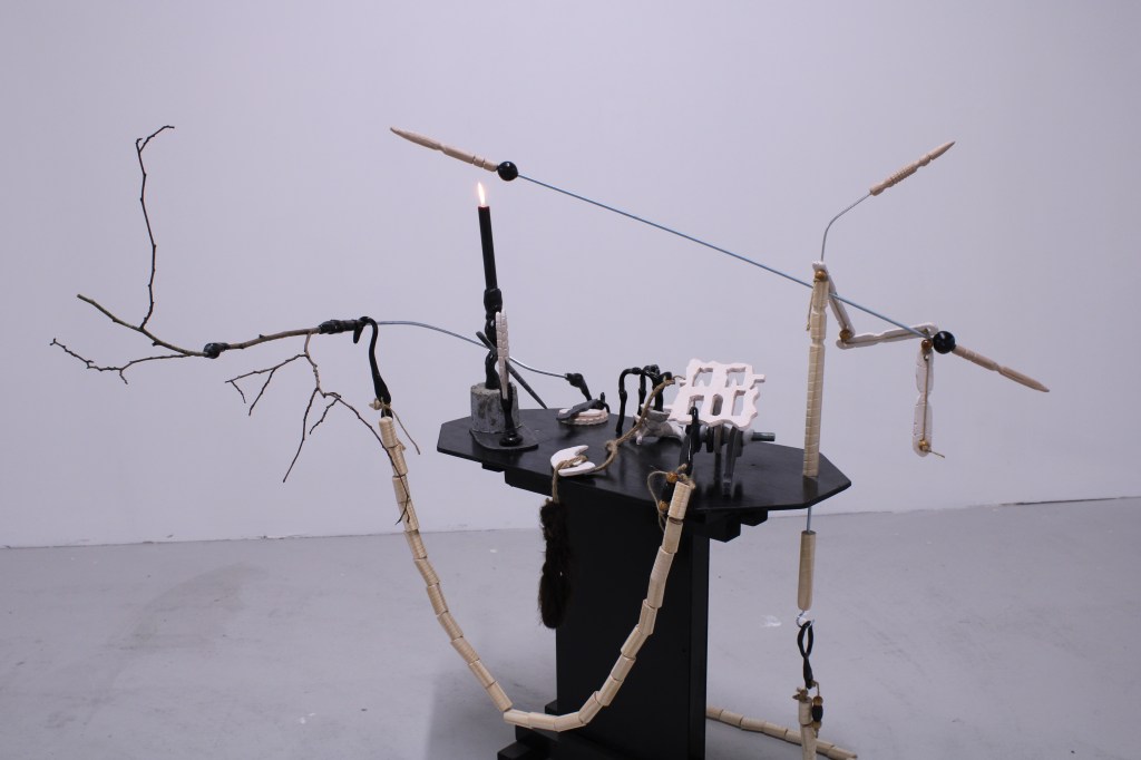 Wood, concrete, twine, jesmonite, thermoplastic, steel, beads, branch, spray paint, candle, faux fur. 107 x 129 x 124 cm. 2020.
