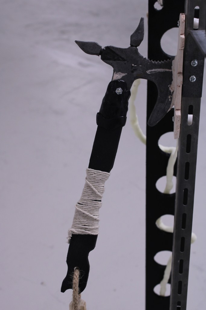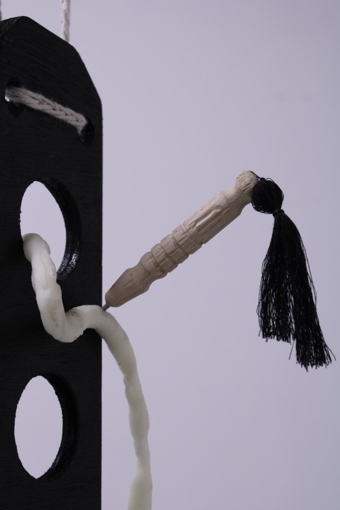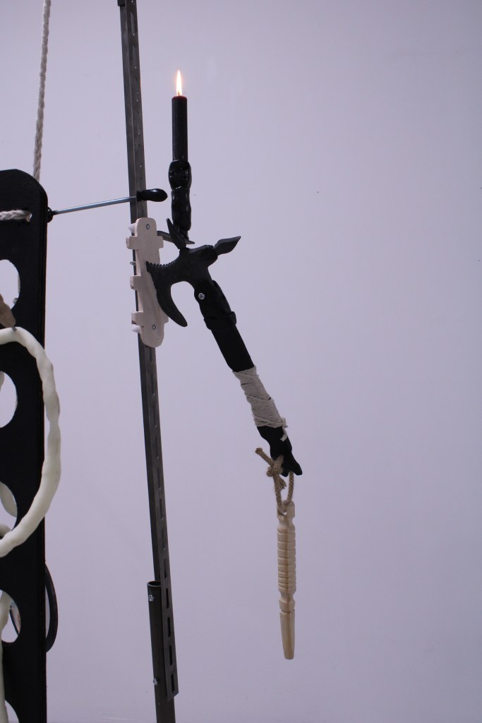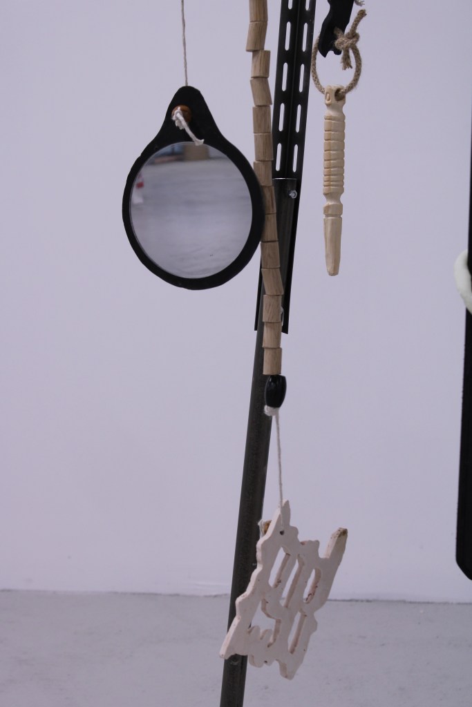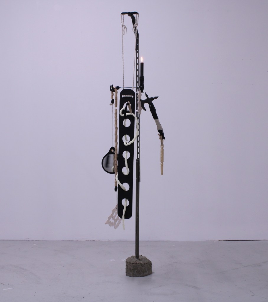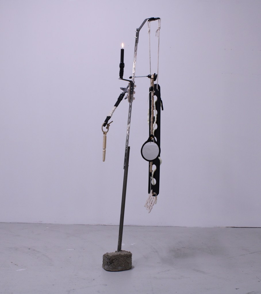 Wood, steel, concrete, silicone, thermoplastic, jesmonite, twine, candle, mirror, thread, acrylic, beads. 175 x 40 x 52 cms. 2020.