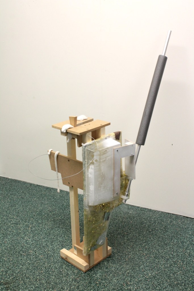 Wood, clay, wire, perspex, aluminium tube, foam, gold foil, cling film, pipe clips, spraypaint, aluminium tape. 2016.