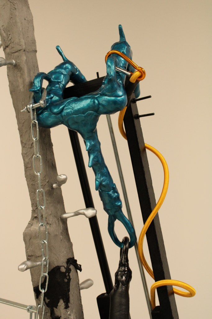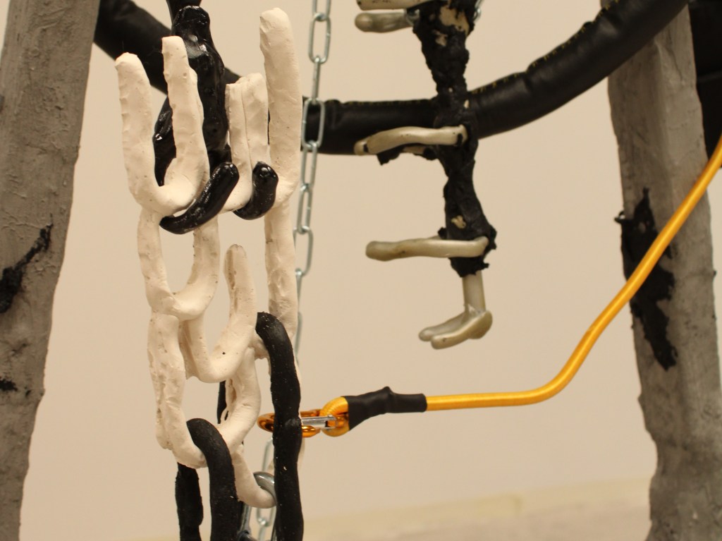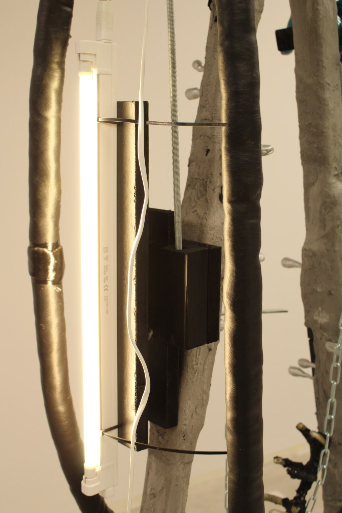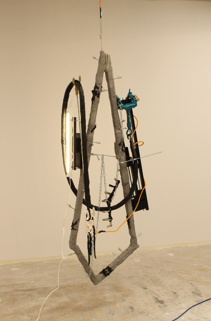 Wood, hessian, plaster, threaded rods, f-clamps, fluorescent light, leatherette, thermoplastic, zip ties, jesmonite, silicone, bungee cord, steel chain, steel shcakles, tension strap, cord, spray paint. 168 x 56 x 27 cms. 2019.