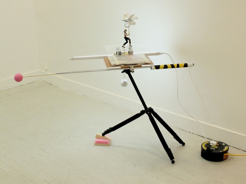 Camera tripod, scrap wood, Tekken action figure, February 1997 issue of “Playstation Magazine”, chrome tube, brass tube, cardboard, D-cell batteries, foam ball, tinfoil, wood skewers, fluorescent light, foam, perspex, magnet, hazard tape, electrical tape. 2015.