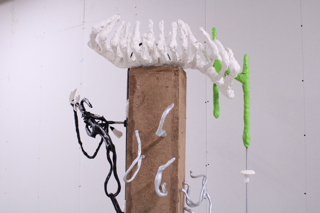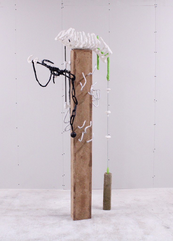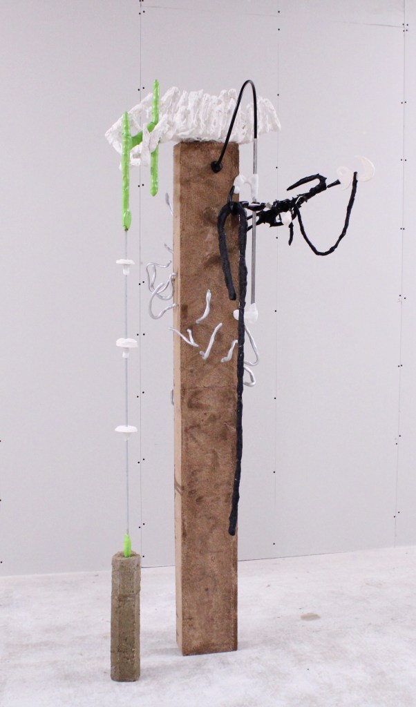 Wood, polyester resin, sand, concrete, thermoplastic, steel, retort clamp, borax crystals, pva, hessian, plaster, epoxy resin, jesmonite, polyurethane tubing, threaded rod, silicone, spray paint. 182 x 85 x 42 cms. 2019.