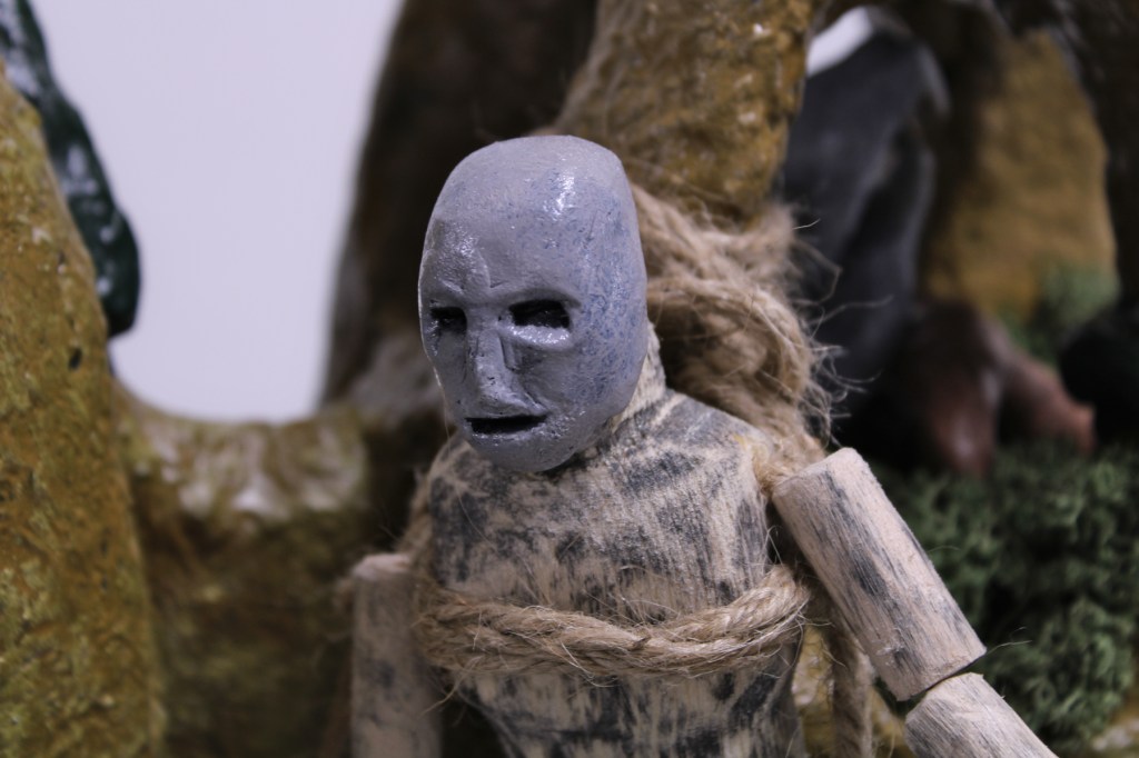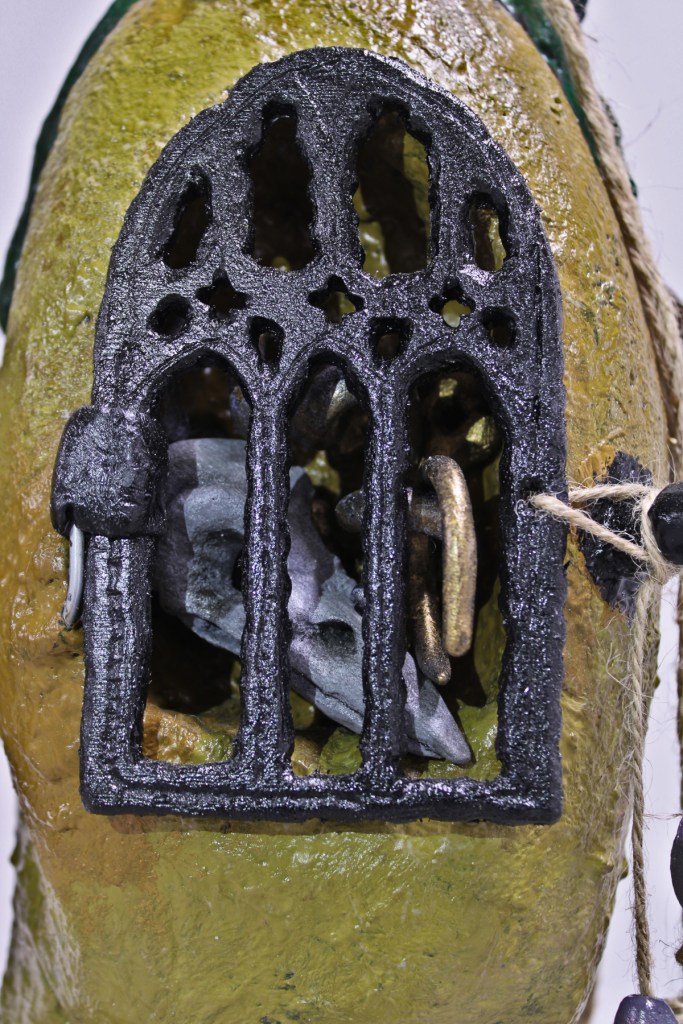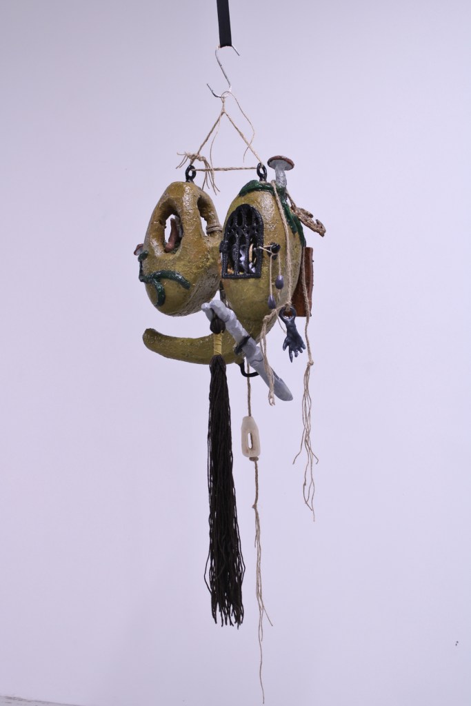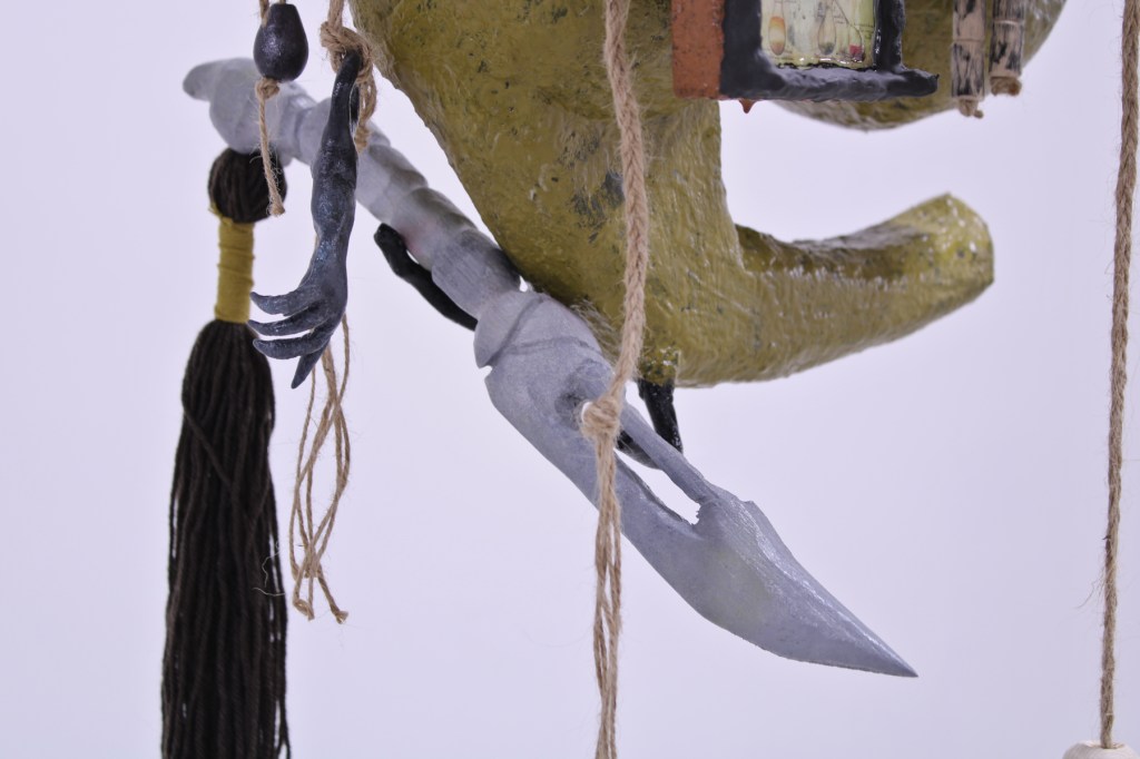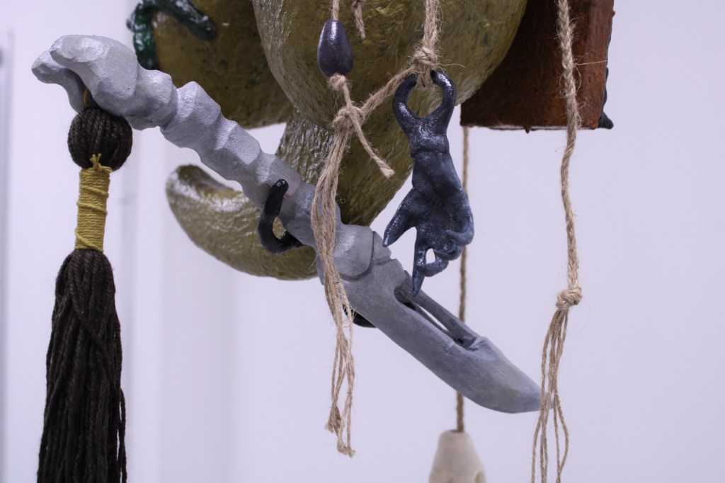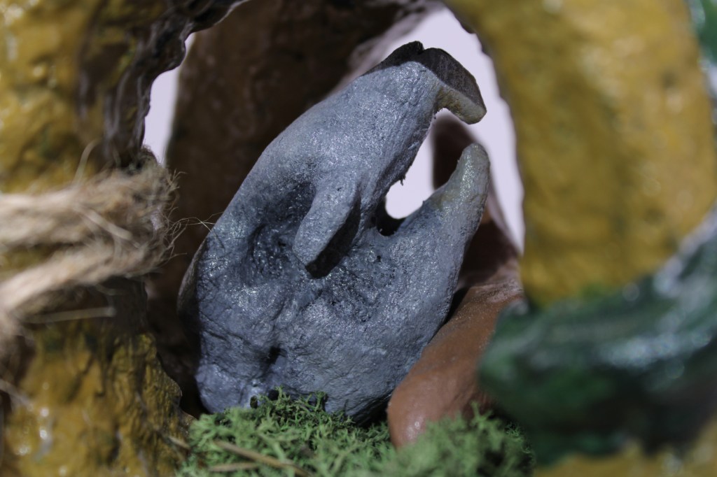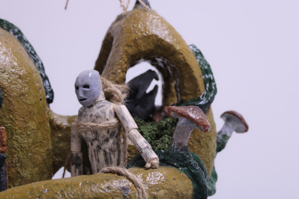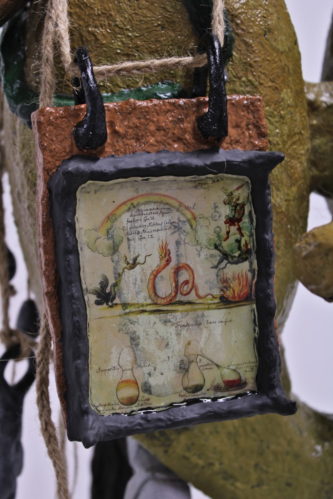 Polystyrene, jesmonite, inkjet print (alchemical manuscript), polyurethane resin, synthetic moss, clay, wood, steel, twine, yarn, thermoplastic, pigment, acrylic paint, sealant. 39 x 102 x 43 cms. 2022.