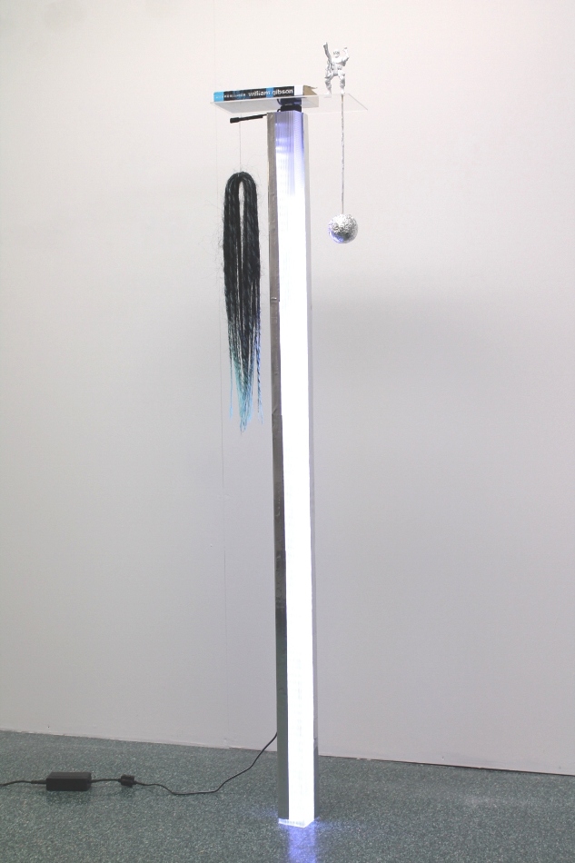 William Gibson’s “Neuromancer”, action figure, dreadlock extensions, foam ball, skewer, perspex, hazard light, led strip, thread, tinfoil, electrical tape, aluminium tape, glue. 2016.