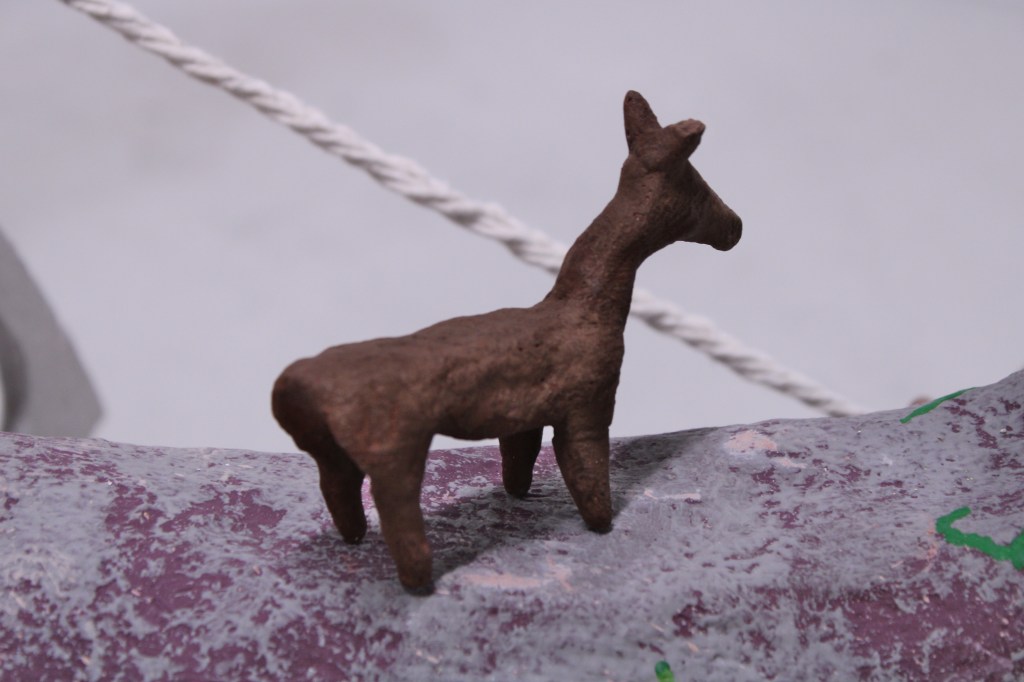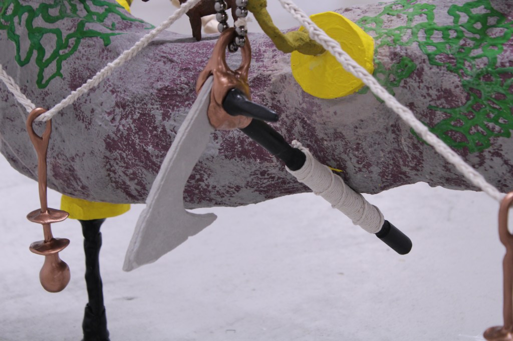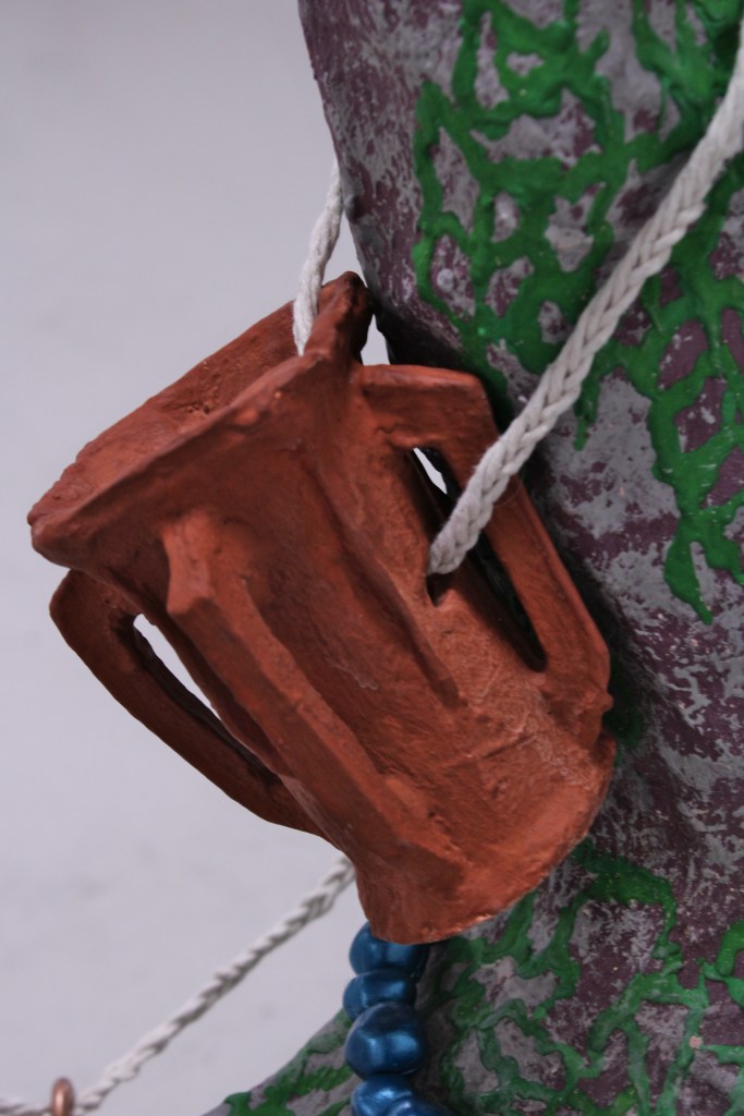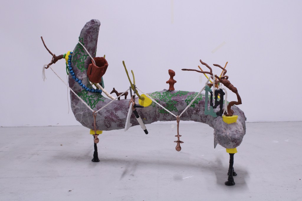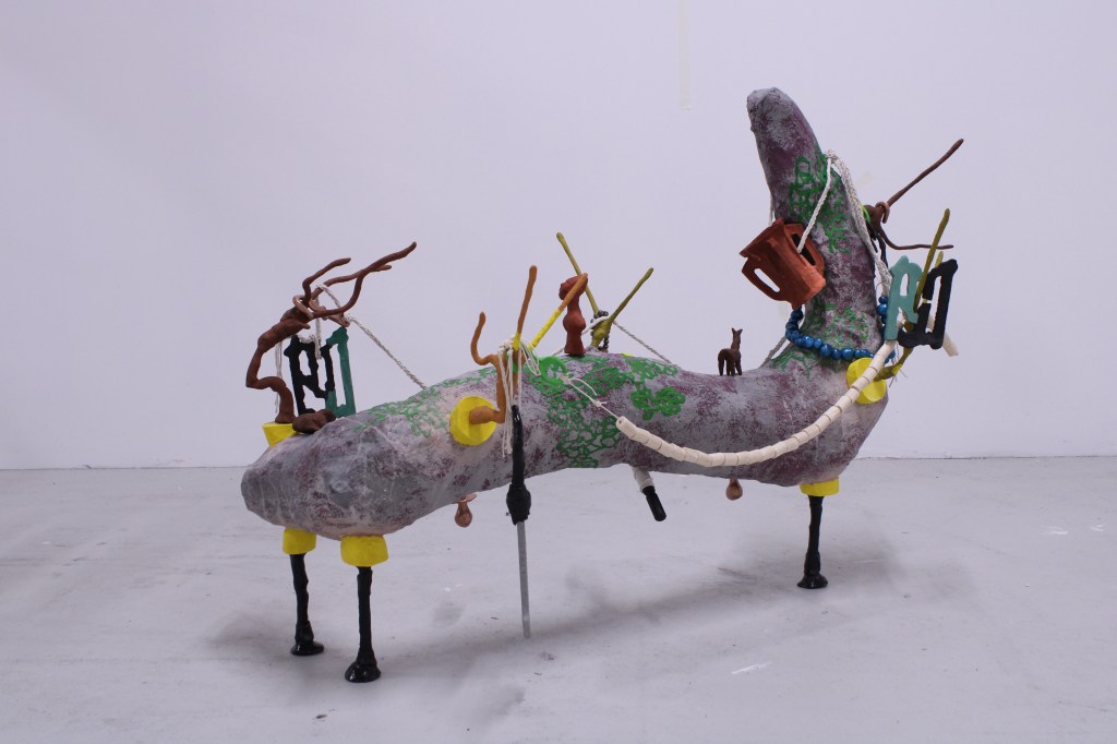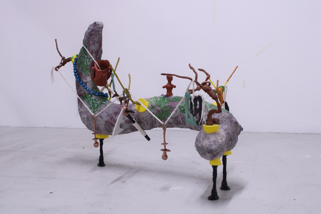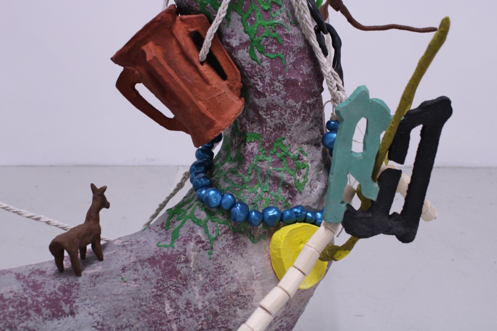 Wire, paper, jesmonite, PVA, thermoplastic, steel, wood, braided twine, clay, pigment, spraypaint, resin.