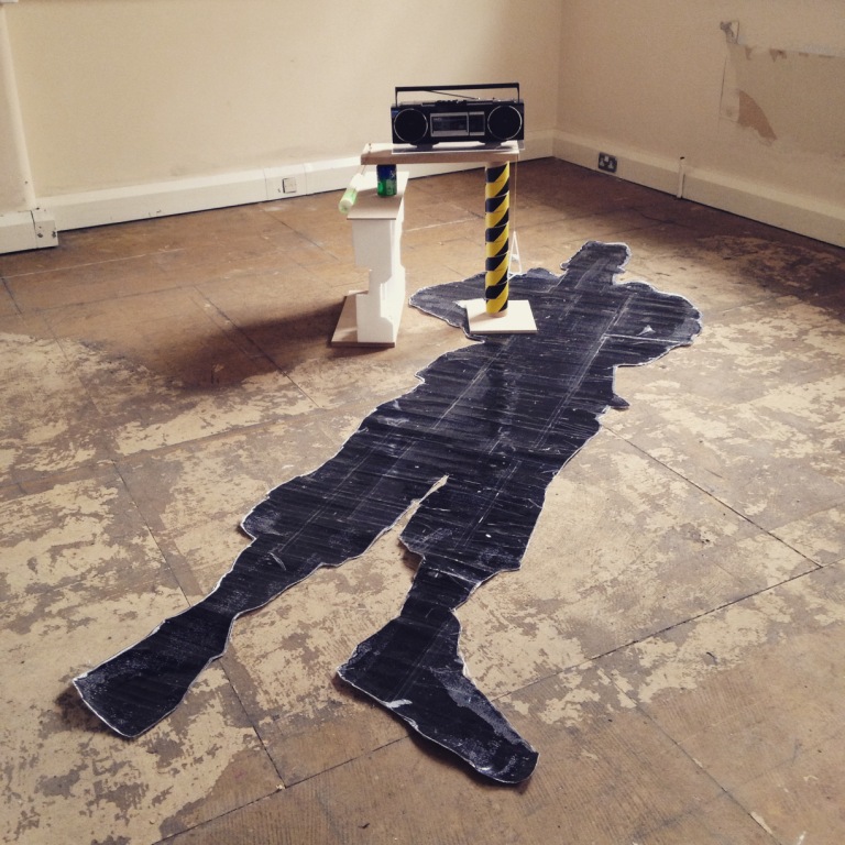 Cassette player, cassette, l.e.d foam light, scrap wood, Sprite cans, styrofoam packaging, used batteries, perspex, cardboard tube, enlarged Tekken doodle, drinking straws, tinfoil, thread, sandpaper, cardboard, rubber bands. 2015.